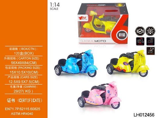 产品名称: 1:14合金小绵羊摩托回力带灯光音乐车(带副驾驶座)